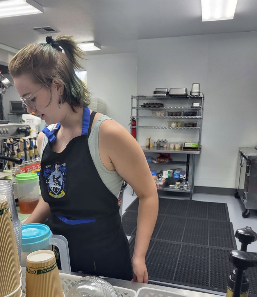 Shasta Ritter, owner of Shasta’s Sweet Treats and Coffee Shop in Henderson, Nevada, prepares an iced coffee. She said the witches are just like other customers: “They grab their coffee, sit down and chat.” Photo by Peter S. Levitt.